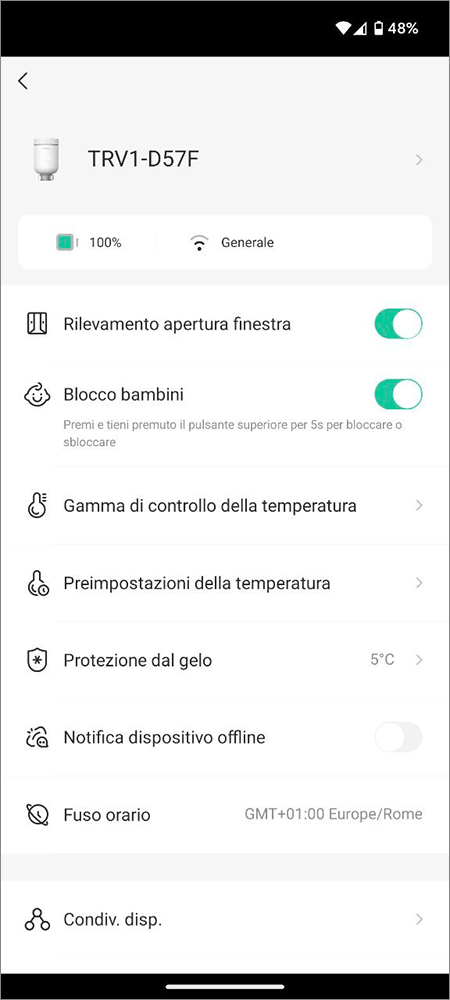 Tramite l’app di gestione è possibile condividere con altre utenze la gestione delle valvole, opzione molto utile in caso di appartamenti “condivisi” o stanze bed&breakfast in cui si voglia temporaneamente fornire la possibilità all’ospite di regolare la temperatura. Sempre tramite l’app è possibile creare delle scene che coinvolgano la geolocalizzazione piuttosto che la temperatura esterna, umidità (non è chiaro da quale servizio online rilevi questi dati, presumiamo da servizi online georeferenziati). È possibile ad esempio attivare la termovalvola se si è geolocalizzati in casa e la temperatura esterna è al di sotto di una temperatura target scelta, insomma una classica “automazione” con condizione, stato, azione e periodo (ovvero quando eseguire questa scena, ad esempio solo di giorno o solo in giorni specifici della settimana).